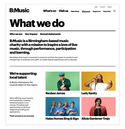 B:Music is the music charity responsible for Town Hall and Symphony Hall in Birmingham. Along with their new name and identity created by Pentagram, a new foyer which doubles as a public performance space, and a revamped mission – they have a new website.