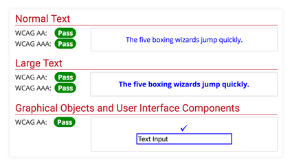 Contrast between text colour and background (called the luminosity contrast ratio) is super-important. This includes text on images, icons, buttons, and as part of maps, diagrams etc.
