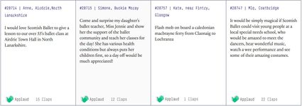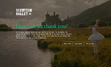 We've built a microsite allowing people to submit their own ideas for how Scottish Ballet can say thank you. Perhaps a performance at a school in the Highlands? A ballet class for residents of a care home? A flash mob in a Scottish city centre street?