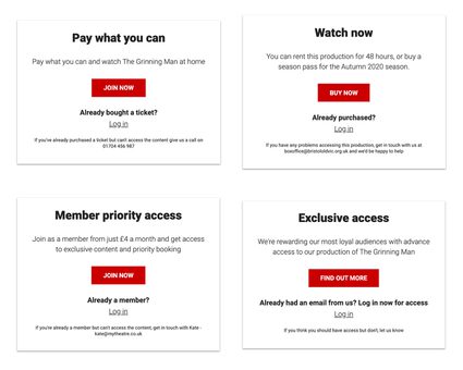 We had to take into consideration the various ways organisations might sell content. This could be via tickets, a donation ask, a membership pass, or – in the case of Bristol Old Vic – a merchandise sale.