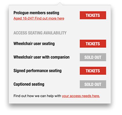 One of the biggest challenges with Access schemes is presenting clear information and allowing users to book even when the performances are sold out for everyone else. Websites will typically present a ‘Sold Out’ button when there are no tickets available; if you’re using seat locks to hold back those Access tickets, you could be presenting a sold-out message even when that’s not the case.