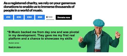 The website is structured so that the ways to support B:Music's work can be added to the website wherever they'll be most effective. Whether that's alongside the charitable mission, woven-in to artists' stories, or as part of news articles about community projects.